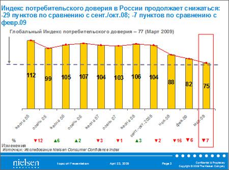 Согласно данным глобального онлайн исследования Nielsen, Индекс потребительского доверия в России впервые упал ниже средней отметки по миру, составив составив лишь 75 пунктов. Из четырех стран группы БРИК − главной надежды мировой экономики в докризисные годы − в России настроения у потребителей самые пессимистичные, − потому что свежи в памяти события в стране десятилетней давности. Впрочем, и деловитые тоже, − потому что есть опыт «выживания» в сложные времена. Россияне планируют экономить в первую очередь на том, на что до недавного времени усиленно тратили − развлечениях вне дома, а также покупке одежды, крупной бытовой техники. 44% сообщили, что перешли на более дешевые марки продуктов питания. Каждый третий экономит на телефонной связи. Сбережения − впервые вошли в число самых популярных способов распорядиться свободными средствами. Но уже каждый четвертый предвкушает возвращение к прежним потребительским привычкам после улучшения ситуации.