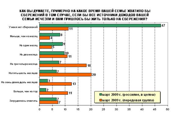Очевидно, что оптимизм опрошенных представителей «передовых групп» в значительной степени связан с их нынешними сравнительно позитивными оценками собственно материального положения, в том числе, выраженного в наличии у них сбережений. Согласно данным опроса населения, только у пяти процентов россиян имеющихся сбережений хватит больше чем на полгода. Почти половина опрошенных (47%) не имеют никаких сбережений. Совсем иная ситуация – среди представителей «передовых групп». Об отсутствии сбережений заявил лишь примерно каждый десятый участник онлайн панели; почти четверть из них смоги бы прожить за имеющиеся сбережения более чем полгода.