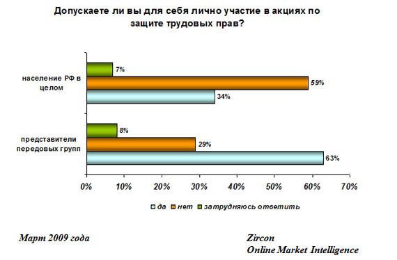 Несмотря на то, что некоторые показатели социального самочувствия россиян имеют тенденцию к снижению, большинство граждан (59%) не допускают для себя лично участия в акциях в защиту трудовых прав. Вместе с тем, около трети опрошенных выразили готовность к участию в организованных выступлениях в защиту трудовых прав в будущем.