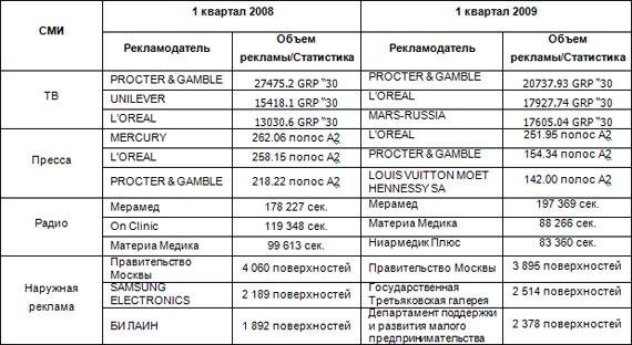 По объему размещенной рекламы в средствах ее распространения компании-рекламодатели из числа лидеров (топ-3) по итогам сравнения первого квартала 2008 и 2009 гг. распределились следующим образом:
