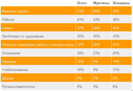 Как видно из таблицы, женщины в целом более подвержены стрессу, независимо от его причины – это могут быть и проблемы в семье и финансовые невзгоды. Исключение составляет работа, которая является главным источником стресса у 43% мужчин и 38% женщин.