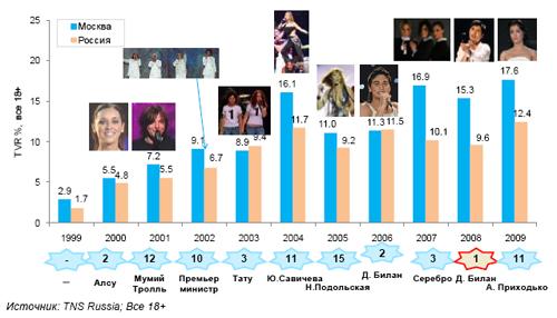 Финал Евровидения-2009 посмотрело более 130 млн телезрителей в 22 странах Европы. 57 млн телезрителей одновременно находились около телеэкранов. Норвегия не только выиграла Евровидение, но и стала лидером смотрения. Низкое смотрение 5 последних в Топе стран можно объяснить тем, что их представители не попали в финал. Смотрение российских телезрителей было на среднем уровне Европы. Российская аудитория Евровидения – одна из самых молодых в Европе.