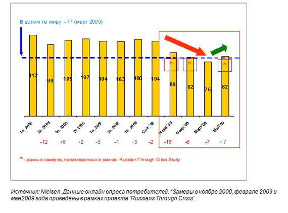 По данным исследования Nielsen ‘Russians through Crisis’, в мае 2009 года динамика Индекса потребительского доверия в России стабилизировалась, снижение прекратилось. Более того, после значительного падения − сначала с 104 пунктов в сентябре 2008 года до 82 в феврале 2009, а затем до 75 в марте 2009 года, − в мае 2009 года Индекс продемонстрировал рост в 7 пунктов, вернувшись на уровень февраля 2009 года (Рис. 1).
