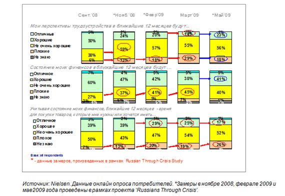 Исследование ‘Russians through Crisis’ (Российский потребитель в кризис) − масштабный исследовательский проект Nielsen − запущен в IV кв. 2008 года для мониторинга уровня потребительского доверия, изменений в покупательском поведении и изучения предпочтений потребителей при покупке товаров и услуг в нынешних экономических условиях в России. С начала запуска было проведено три волны − в ноябре 2008, феврале и мае 2009 года.
