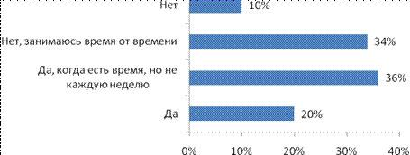 Как становится ясно из рисунка №1, только 1/5 часть опрошенных отметила, что регулярно занимается тем или иным спортом, в то время как в свободное от других дел время, спортивным нагрузкам посвящают свое время около 1/3 респондентов. А каждый 10-ый из опрошенных отмечал, что в его жизни спорту нет места.