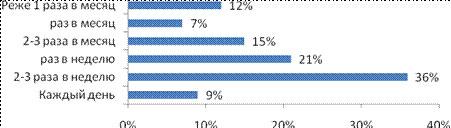Из тех, кто все-таки находит время на то, чтобы поддерживать себя в хорошей форме благодаря физической активности лишь каждый десятый делает это ежедневно. Самое большое количество людей, занимающихся спортом, могут уделять ему 2-3 дня в неделю – 36%. Еще столько же участников исследования указали, что спортом занимаются от 2-х до 4-х раз в месяц (рис. №2). Интересно, что те, кому удается 1 раз в месяц или того реже позволить себе тот или иной вид физической активности причисляют себя к категории людей, которые спортом все-таки занимаются.