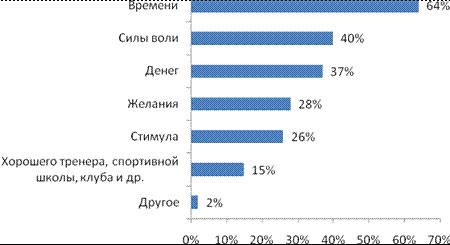 Исследование также показало, что 66% респондентов с различной регулярностью, но спортом занимаются (см. рис. №1). Что же является причиной, которая мешает уделять необходимое внимание своей физической форме большинству опрошенных? Порядка 64% указывают на недостаток времени как на одно из самых главных препятствий на пути к здоровому образу жизни. Еще 40% не хватает силы воли. Более чем треть респондентов признались, что преградой является нехватка денег. Также, более четверти участников исследования сослались на отсутствие стимула и желания, которые бы смогли сподвигнуть их на спортивные «подвиги». Интересно, что 15% заниматься спортом не позволяет отсутствие достойных наставников, спортивных комплексов и т.д.