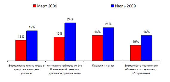 Большинство россиян (70%) по-прежнему заявляет, что “в период кризиса покупателю нужно чувствовать заботу производителей, важны рекламные акции и дополнительные услуги”. В целом по России доля респондентов, считающих, что в период кризиса важен не бренд, а цена товара, увеличилась на 4% и составила 59%.Более выгодные условия при покупке товара - призы и подарки, антикризисные ценовые предложения сейчас становятся важнее дополнительных опций, клубных карт, бальных программ лояльности.Наиболее привлекательными акциями по продаже товаров респонденты называют скидки и бонусы, накопительные скидки с возможностью приобрести на набранные баллы товары в данном магазине, антикризисные продукты (по более низкой цене или урезанные предложения). Доля респондентов, считающих антикризисные продукты более привлекательными, выросла по России за последние три месяца на 9% и составила 24%.