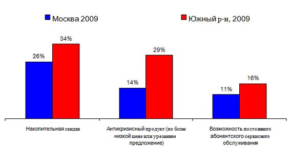 Если москвичи - искушенные и опытные шопперы, не всегда легко поддающиеся на изощренные предложения маркетологов и внимательно изучающие конечную цену, то в регионах респонденты в большей степени испытывают необходимость чувствовать себя защищенными, так как кризис более негативно отразился на их финансовом состоянии. Доля респондентов, считающих антикризисные предложения с более низкой ценой очень привлекательными, в южном регионе увеличилась за последние три месяца на 12 % и составила 29%. В этом же регионе доля желающих получить накопительную скидку в магазине увеличилась на 9% по сравнению с мартом.