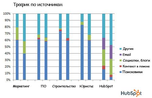 В таблице в левом столбике для четырех категорий сайтов и для сайта HubSpot показан процент посетителей, пришедших из разных источников; в правом - потенциальных клиентов. Получилось, что для юридических компаний из поиска приходит больше 80% пользователей. Из других источников, в которые входили сайты и каталоги, и из социалок и блогов на сайт приходило гораздо меньше пользователей. Но если смотреть соотношение не пользователей, а потенциальных клиентов, то мы увидим, что 40% из них сгенерировались не поиском. Компании, оказывающие маркетинговые и PR-услуги, получили более 60% потенциальных клиентов не их поиска. Поэтому рекламным агентствам стоит обратить внимание на корпоративный блог, активность в социальных сетях и сообществах.