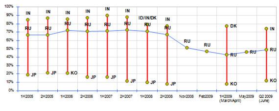 В России, державшей первенство по этому показателю в сентябре-октябре 2008 года, этот показатель вырос на один пункт по сравнению с волной в конце первого квартала 2009 года (марте-апрель 2009) и составил 34%, но не приблизился к докризисному показателю в 52%.