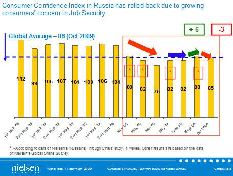 Индекс потребительского доверия, важный показатель настроений потребителей и их покупательской активности, рассчитывается Nielsen регулярно на основе таких индикаторов, как оценка потребителями своих перспектив на рынке труда и состояния собственных финансов, а также готовность тратить. Снижение Индекса потребительского доверия в России в октябре 2009 произошло из-за роста пессимизма россиян по поводу своих перспектив трудоустройства в ближайшие месяцы.