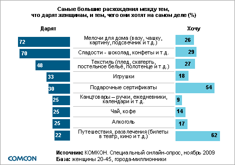 Если по лидирующим категориям желания женщин исполняются чаще всего – украшения получают в подарок 61% опрошенных, цветы – 82%, деньги – 77%, то по отдельным категориям наблюдаются существенные расхождения между желаемым и действительным. Самыми неоцененными оказываются мелочи для дома (вазы, чашки, декоративные фигурки). Такие подарки дарят 72-м% женщин, при этом лишь четверть опрошенных (26%) были бы им рады.Вопреки распространенному мнению, женщины, заботясь о фигуре, не часто бывают в восторге от сладких сюрпризов. Сладости дарят 70-ти% женщин, но лишь 29% опрошенных хотели бы получать конфеты, шоколад и прочие вкусности.