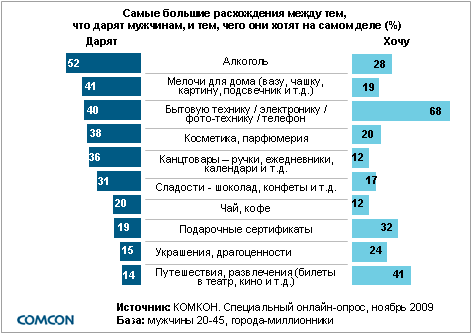 Бытовую технику в подарок мужчинам дарят реже, чем им хотелось бы (40% получают в подарок, 68% - хотят). Алкоголь же, напротив, получает 52% представителей сильной половины человечества, но видеть его в качестве подарка хотели бы меньше трети опрошенных (28%).