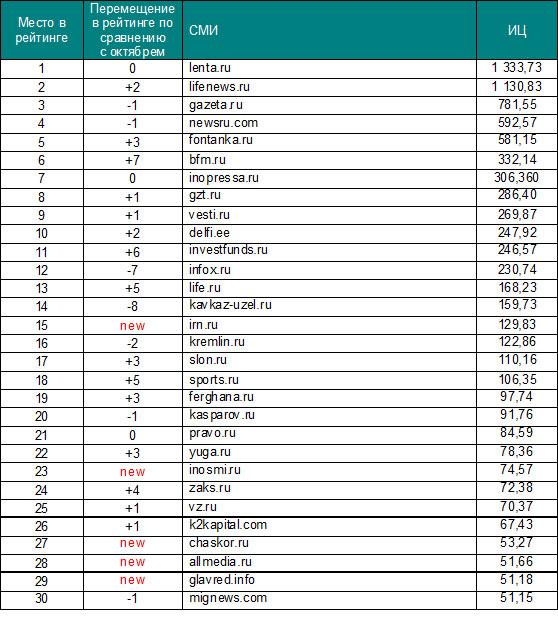 Лидерами ноябрьского рейтинга цитируемости Интернет-изданий Рунета стали lenta.ru, lifenews.ru и gazeta.ru.