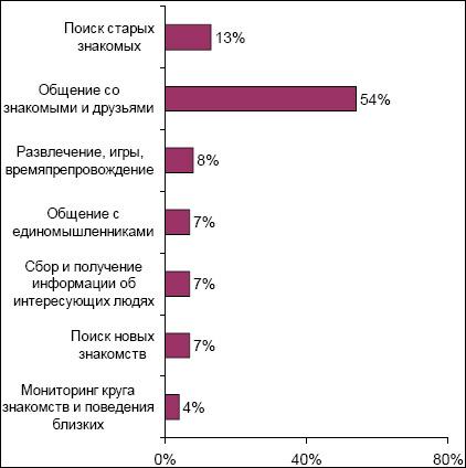 Согласно полученным данным, 54% подписчиков социально ориентированных сервисов в нашей стране используют их для общения с друзьями. Для 13% респондентов социальные сети — это инструмент поиска старых знакомых, для 7% — новых. Еще 8% опрошенных признались, что рассматривают социальные сети как способ времяпрепровождения, игру или развлечение.