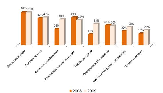 Для выявления общих тенденций потребления небезыинтересно проследить динамику покупательского спроса в Глобальной сети. Если в 2008 году только 25% продаж в Сети приходилось на группу товаров «Косметика и парфюмерия», то в 2009 году эта цифра существенно возросла - до 40%. В два раза, по сравнению с 2008 годом, – с 17% до 33% - выросло и число пользователей, делающих выбор в пользу товаров для детей. Увеличилось количество респондентов, покупающих в онлайн-магазинах продукты питания (с18% до 23%) и билеты на развлекательные мероприятия (с 22% до 28%).