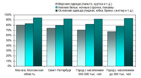 В результате опроса было выявлено, что наиболее емким сегментом рынка женской одежды с самым большим количеством покупателей является рынок основной одежды для женщин (под которым подразумевается вся одежда, кроме нижнего белья, чулочно-носочных изделий и верхней одежды и включает такие предметы одежды, как пиджак, юбка, брюки и свитер и т.д.), далее следует рынок нижнего белья и верхней одежды. Это связано, прежде всего, с частотой обновления одежды в данных сегментах – верхняя одежда, как правило, обновляется значительно реже, чем нижнее белье и обычная повседневная одежда. Так, среди жительниц Москвы и Московской области около 94% указали, что покупали в 2009 г. основную одежду, около 83% - что покупали предметы нижнего белья и 80% - верхнюю одежду. Доля покупательниц в разных сегментах рынка женской одежды от общего количества жительниц не сильно зависит от величины городов, в которых они проживают, будь то мегаполисы или маленькие города. Только в сегменте верхней одежды место жительства оказывает некоторое влияние на покупательскую активность. Прослеживается, что доля покупательниц верхней одежды несколько снижается по мере уменьшения численности населения городов, в которых они проживают. Рис. 2 Доля женщин, покупавших разные виды женской одежды в 2009 г. в разных городах России, % от общего количества женщин в каждом из городов