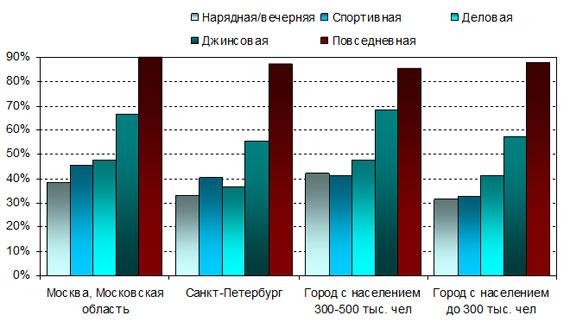 Источник: РосБизнесКонсалтингСреди категорий основной женской одежды наиболее емким сегментом по количеству покупателей является сегмент повседневной одежды. Потом следует сегмент джинсовой одежды, деловой, спортивной и на последнем месте находится сегмент праздничной нарядной женской одежды.Рис. 3 Доля женщин, покупавших разные категории женской повседневной одежды в 2009 г. в разных городах России, % от общего количества женщин в каждом из городов