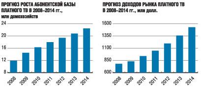 Согласно исследованию, стабильный рост был отмечен и в отношении объемов рынка платного ТВ в России. На конец 2008 года индустрия платного телевидения выросла почти на 5% и достигла уровня 780 млн долл. По итогам прошлого года объем рынка вырос на 6% по сравнению с 2008 годом и составил около 830 млн долл. В настоящий момент J’son & Partners Consulting прогнозирует возможный рост доходов рынка от услуг платного ТВ к 2014 году до 1,53 млрд долл.