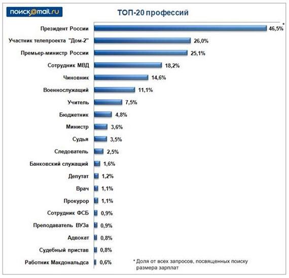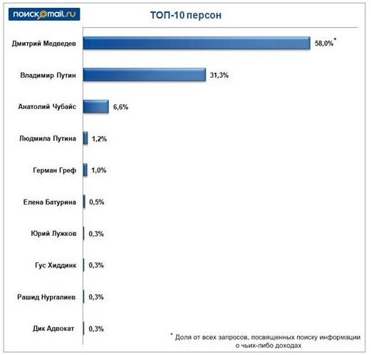 Чаще всего российские интернет-пользователи интересуются зарплатами президента России, утверждают специалисты интернет-службы «Поиск@Mail.Ru», проанализировавшие статистику 600 000 поисковых запросов за последний месяц, содержащих слова «сколько получает», «зарплата» и «доходов».
