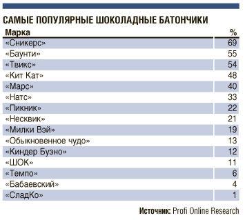 Как выяснила аналитическая компания Profi Online Research, каждый пятый молодой человек покупает шоколадный батончик каждый день. Самым популярным в рейтинге оказался «Сникерс».