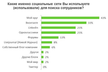 Для тех, кто использует социальные сети с целью найма персонала, наиболее популярной сетью является проект «Мой круг»: 43% опрошенных используют ее как дополнительный инструмент рекрутинга. Социальные сети «Вконтакте», LinkedIn и «Одноклассники» используют в своей работе 25-33% HR-специалистов. Хуже всего для поиска сотрудников подходят блоги, Twitter и сеть «Мой мир».