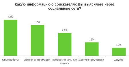 Чаще всего при поиске персонала HR-специалисты интересуются информацией о том, где и как долго работал кандидат, какой он имеет опыт работы. 27% менеджеров по персоналу выясняют информацию о профессиональных навыках и еще 16% о достижениях и успехах кандидата. Практически каждый третий работодатель интересуются личной информацией о кандидате.