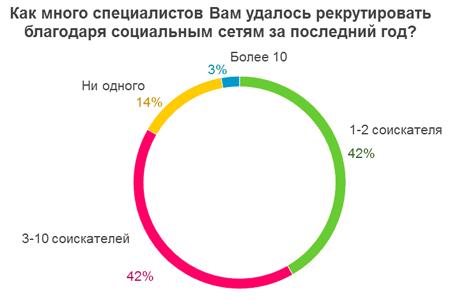 Статистика найма за последний год показывает, что через социальные сети в среднем за год работникам HR-департаментов удается найти от 1 до 10 сотрудников. В основном через социальные сети ищут менеджеров среднего звена, секретарей, торговых представителей и консультантов, IT-специалистов, в некоторых случаях - менеджеров высшего звена и руководителей. 14% опрошенных признали, что, несмотря на то, что они ведут поиск сотрудников через социальные сети, до сих пор никого не нашли. Как и следовало ожидать, чаще всего успеха в поиске достигают те работодатели, которые ведут активный поиск кандидатов, а не ждут откликов от самих соискателей.