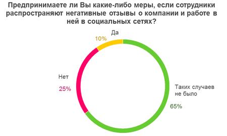 35% опрошенных работодателей признали, что сотрудники их компании распространяли негативные отзывы о компании и условиях работы в социальных сетях. Из них большинство решили не предпринимать никаких мер в отношении сотрудника, и только треть применила различные санкции. Чаще всего сотруднику делают официальный выговор или «беседуют по душам», лишь в некоторых случаях дело доходит до увольнения. Показательно, что в маленьких компаниях (до 10 сотрудников) наказание за негатив в интернете по отношению к компании следует во всех случаях, в то время как в более крупных компаниях на это могут закрыть глаза.
