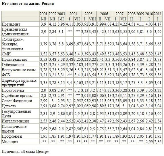 Как показал опрос, проведенный специалистами компании, роль президента и олигархов в жизни страны население оценивает довольно высоко. Выставляя оценки по пятибалльной шкале от «очень большую» до «очень малую», респонденты в среднем наделили главу государства 4,17 баллами, на втором месте администрация президента и правительство - по 3,69 и 3,78 баллов соответственно. Далее с небольшим отрывом следуют олигархи, банкиры и финансисты, получившие оценку влиятельности в 3,63 балла.
