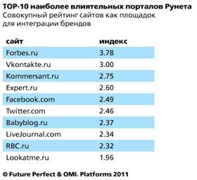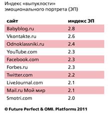 Также большое влияние на пользователя имеют сайты Vkontakte.ru, Expert.ru, Kommersant.ru, Facebook.com, Twitter.com, Babyblog.ru, LiveJournal.com, RBC.ru, Lookatme.ru. Они в высокой степени соответствуют эмоциональным потребностям своих посетителей, их аудитория и контент пользуются уважением и доверием.