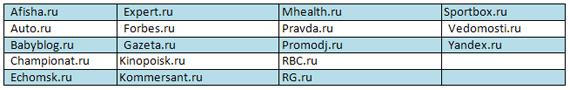 Список исследуемых сайтов: Afisha.ru; Aif.ru; Auto.ru; Autorambler.ru; Babyblog.ru; Championat.ru; Cosmo.ru; Echomsk.ru; Expert.ru; Facebook.com; Forbes.ru; Gazeta.ru; Gzt.ru; Kinopoisk.ru; Kommersant.ru; KP.ru; Lenta.ru; LiveInternet.ru; LiveJournal.com; Loveplanet.ru; Lookatme.ru; Mail.ru; YouTube.com; Mail.ru Дети; Mail.ru Знакомства; Mail.ru Леди; Mail.ru МойМир; Mamba.ru; Mhealth.ru; Maximonline.ru; Odnoklassniki.ru; Passion.ru; Pravda.ru; Promodj.ru; Rambler.ru; RBC.ru; RG.ru; Rutube.ru; Smotri.com; Snob.ru; Sportbox.ru; Twitter.com; Tvigle.ru; Utro.ru; Vedomosti.ru; Vesti.ru; Vkontakte.ru; Woman.ru; WomanJournal.ru; Yandex.ru
