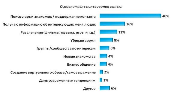 В этих и во множестве других социальных сетей российские пользователи преследуют различные цели. Согласно исследованию, функция поиска людей, общения и поддержания контакта находит востребованность у 40% пользователей. Обращаются к соцсетям за поиском информации о людях всего 16%. При этом 10% российских пользователей заходит на виртуальную платформу в поисках развлечения или бесцельного времяпрепровождения.