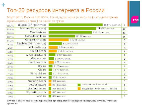 Самыми популярными площадками Интернета, в марте 2011 года стали: бессменный лидер по численности аудитории - Яндекс (37 проектов) с аудиторией в 16,6 млн. человек, Mail.ru (33 проекта) с аудиторией 14,6 млн. человек и Vkontakte.ru (13,2 млн. человек). Также в Топ-10 ресурсов Интернета попали Odnoklassniki.ru, Google (ru+com), Rambler (30 проектов), Wikipedia.org, Youtube.com, LiveJournal.com, Gismeteo.ru. При этом больше всего времени пользователи проводят на сайте Vkontakte.ru – в среднем 43 минуты в день, чуть меньше россияне тратят на сайте Odnoklassniki. ru (26 мин. в день), на проекты Mail.ru – 16 мин. в день.