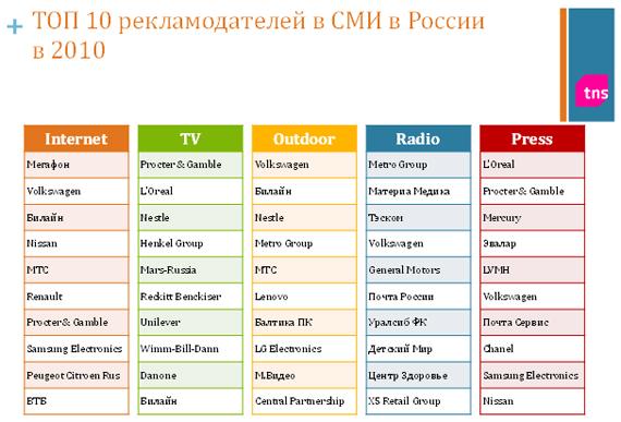 Также TNS Россия представила результаты нового исследовательского проекта по мониторингу рекламы в Интернете. Согласно результатам исследования за 2010 г. лидерами среди рекламодателей Рунета по бюджету стали компании Мегафон, Volkswagen и Билайн.
