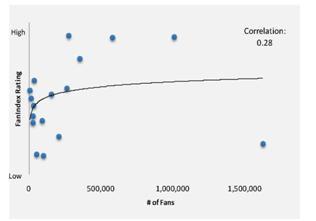 Количество поклонников имеет важное значение для фанатской страницы, но само по себе оно не может служить показателем эффективности страницы. Конечно, между рейтингом FanIndex и количеством поклонников имеется определенная взаимосвязь, но некоторые относительно небольшие страницы смогли добиться высоких рейтингов, тогда как страница с наибольшим числом поклонников (проанализированная в рамках исследования) показала один из самых низких общих рейтингов.