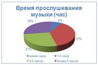 Больше трети (37%) опрошенных слушает музыку от 1 до 3 часов в сутки (см. рис. 1), 27% - от 3 до 5 часов, еще треть (30%) - более 5 часов. Только 6% респондентов слушают музыку менее часа в день.