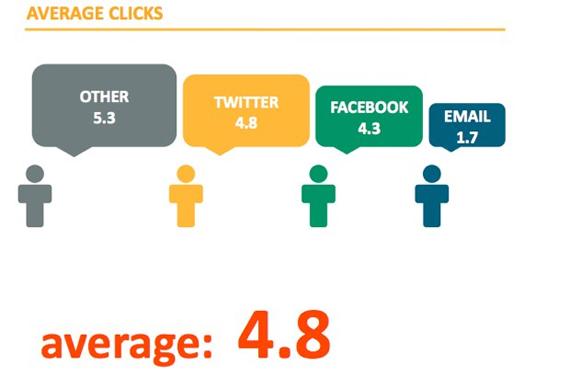 — По ссылкам Twitter пользователи кликают активнее. Среднее количество кликов по ссылкам Twitter’а – 4,9, Facebook – 4,3