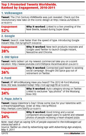 В Twitter маркетологи продолжают создавать новые рекламные продукты - «продвигающие твиты» (promoted tweets), продвигающие тренды (promoted trends) и продвигающие аккаунты (promoted accounts). У этой сети средние показатели взаимодействия потребителя с «продвинутыми твитами» - 3-5%, и они поднимаются до 7-10% в случае, если «продвинутые твиты» сочетаются с «продвинутыми трендами». А во многих заметных кампаниях был продемонстрирован куда больший уровень взаимодействия, говорится в сети микроблогов и на AdAge.