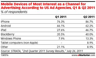 Тем не менее, исследования показывают, что маркетологи продолжают обращать больше внимания на iPhone. Медиабаинговый обзор Q2 от SPATA за 2011 год показал – почти в 87% рекламных агентств США считают, что iPhone представляет больший интерес для их клиентов в качестве рекламного носителя. Это превысило показатели Q1 более чем на 10 процентов. При этом, примерно в половине агентств заявили, что их клиенты заинтересованы и в рекламе на IPad.