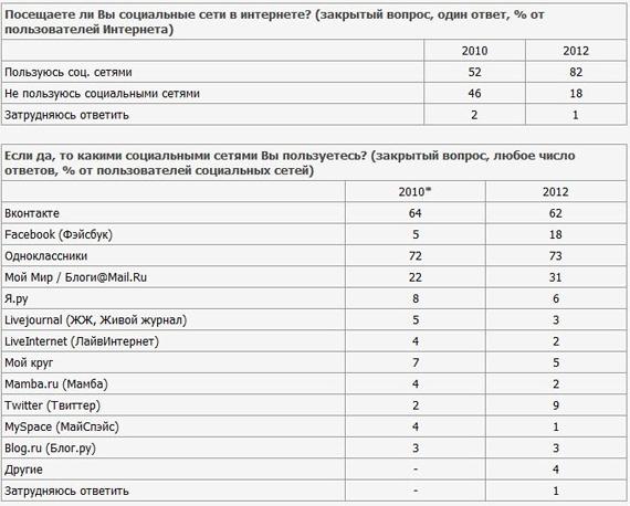 Самая популярная социальная сеть рунета – «Одноклассники», на втором месте «ВКонтакте», показало исследование ВЦИОМ, проведенное 4-5 февраля 2012 г. Как свидетельствуют полученные данные, сейчас в социальных сетях зарегистрировано 82% пользователей интернета (2 года назад – 52%). Всего доля пользователей Сети составляет 55%