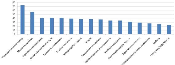 Безусловным лидером по количеству размещений третий год подряд является фармацевтический сектор (12%). Впервые в TOP групп товаров и услуг вошли ритеил/производство техники и электроники, туристические компании. Ощутимо повысил рекламную активность финансовый сектор, переместившийся с восьмого на четвертое место (см. График 1).