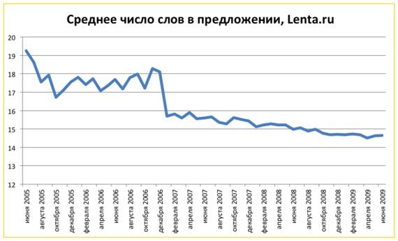 Исследование выявило, что в обследованных изданиях изменения длины были не случайны, а укладывались в два тренда. Для Lenta.ru во второй половине 'нулевых' годов характерно постепенное сокращение 'среднего предложения'. Анализ 460 тысяч предложений показал, что с июня 2005 по июнь 2009 длина упала почти на четверть и стабилизировалась на уровне 14,5–15 слов на предложение.