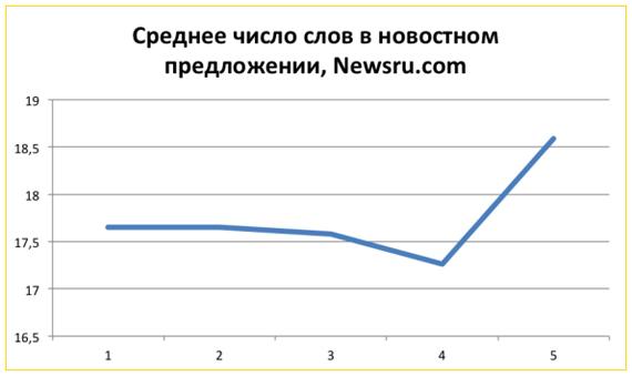 У NewsRu.com длина предложения колеблется между 17,26 и 18,59 словами. На графике за 5 расчётных периодов (полугодий) можно обнаружить как рост средней величины, так и период стабильности или даже падения.