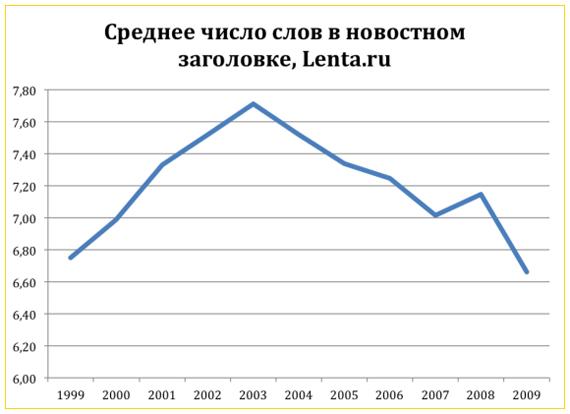Заголовки исследованных изданий различаются. И длиннее, и сложнее они оказываются у NewsRu.com. Распространенные и сложные предложения в заголовках дают среднюю длину в 9,64 слова. У Lenta.ru с 1999 по 2009 год в заголовках было от 6,66 до 7,71 слов. При этом заголовок образца 2009 года на 11% короче заголовка 2004 года.