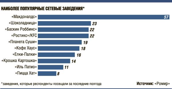 Выяснилось, что восемь из десяти опрошенных горожан с различной частотой посещают сетевые кафе и рестораны. Самым популярным заведением у россиян оказался McDonald’s, который со значительным отрывом лидирует в рейтинге наиболее посещаемых заведений: 57% опрошенных россиян побывали в американской сети фастфуда за последние полгода. Следом идут «Шоколадница» (посетили 23% респондентов), «Баскин Роббинс» (22%), «Ростикс»/KFC (22%) и «Планета суши» (19%). Замыкают десятку посещаемых ресторанов «Иль Патио» (11%) и «Пицца Хат» (8%).