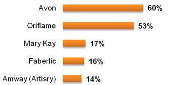 Лидерами сетевых продаж парфюмерии и косметики в России являются компании Avon и Oriflame. У них покупали 60% и 53% соответственно из числа тех, кто вообще покупает парфюмерию и косметику у распространителей. 3-5 позиции с огромным отставанием от лидеров делят Mary Kay (17%), Faberlic (16%) и Amway (14%). Доли остальных игроков ниже статистической погрешности.