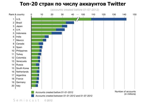 По данным аналитиков, в России - около 8 млн пользователей Twitter. По этому показателю Россия занимает 14-ю позицию, уступая Венесуэле (13-я позиция), Колумбии (12-я позиция) и Турции (11-я строчка).
