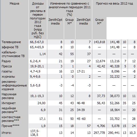 Осень прошлого года ознаменовалась для рекламного рынка сокращением многими производителями товаров повседневного спроса, прежде всего транснациональными корпорациями, своих изначально запланированных маркетинговых бюджетов. Соответственно, прогнозы и на 2012 год были предельно консервативными: от большинства рекламодателей ожидали снижения рекламной активности. Но в январе—марте рынок в целом продемонстрировал лучшую динамику, чем предполагалось в конце 2011 года, признавал ранее гендиректор группы 'Видео Интернешнл' Сергей Васильев. По оценке АКАР, в первом квартале общие расходы на рекламу выросли на 14%, до 61-62 млрд руб. без НДС. Расходы только на телерекламу увеличились на 10%, до 31,1-31,6 млрд руб.